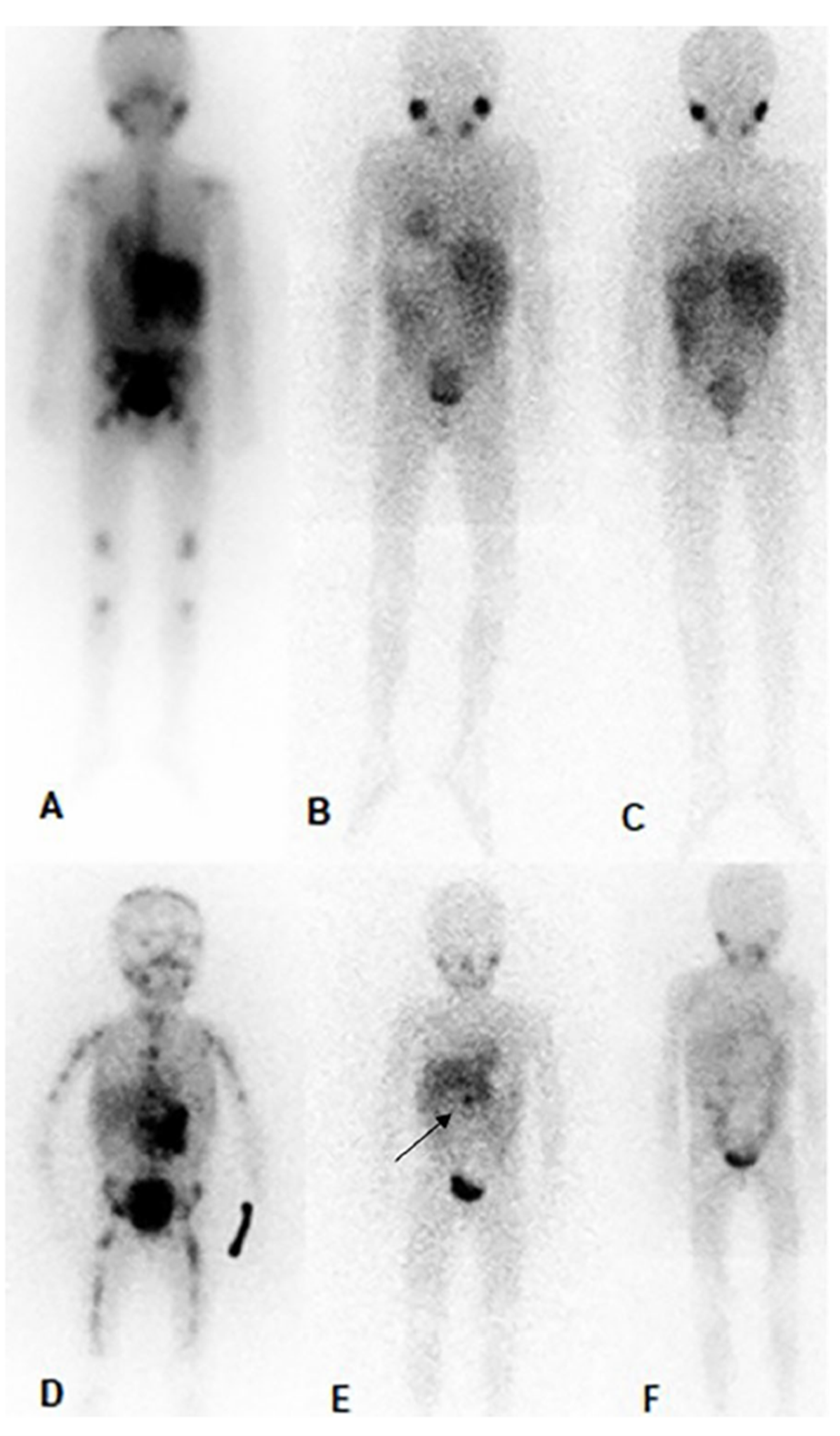 图3. 3号和10号患者治疗前(左)、6周期治疗后(中)治疗后6个月(右,SIOPEN评分均为0)的MIBG影像学表现