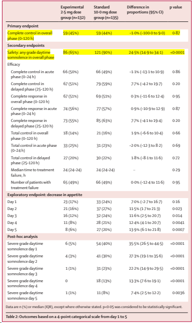 除第1天的患者比例无显著性差异(2.5 mg奥氮平组 vs. 10 mg奥氮平组:17% vs. 24%,p=0.16)外,第2~5天2.5 mg奥氮平组食欲减退的患者比例显著更低。