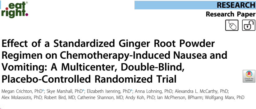 一项临床研究纳入103例接受中、高致吐风险化疗的成年肿瘤患者,将其分配至姜根胶囊组(n=52)或安慰剂组(n=51)接受CINV的预防。研究于化疗开始当天对患者进行持续5天的干预,共干预3个周期。研究旨在评估姜对CINV相关生活质量(QoL)和临床结局的影响。