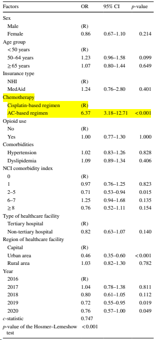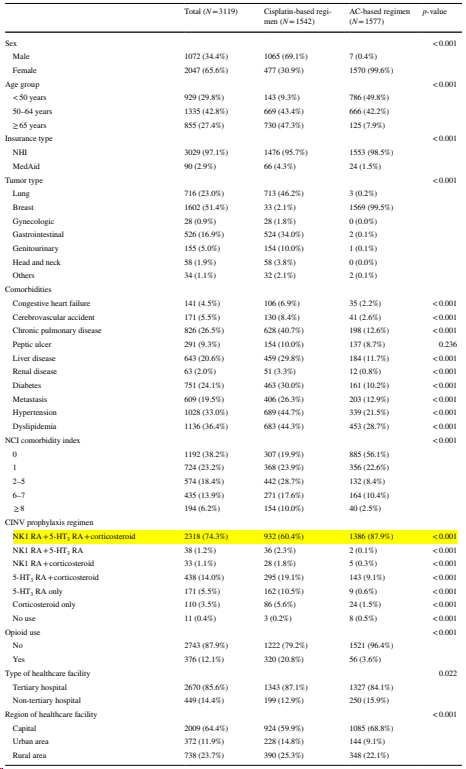 韩国一项回顾性研究纳入3119例≥20岁、接受2种高致吐风险化疗方案(蒽环类+环磷酰胺【AC】、顺铂)的实体瘤患者,评价首个化疗周期中CINV预防方案5-HT3 RA+NK1 RA+糖皮质激素的使用情况以及美国国立综合癌症网络(NCCN)指南的依从率。