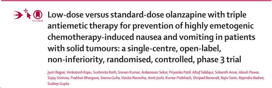 一项临床研究纳入275例接受多柔比星+环磷酰胺或顺铂治疗的实体瘤患者(267例纳入改良意向性治疗人群,其中乳腺癌患者占比91%),将其随机分配至2.5 mg奥氮平组(n=132)或10 mg奥氮平组(n=135)接受CINV预防。患者同时联合使用5-羟色胺3受体拮抗剂(5-HT3 RA)+神经激肽1受体拮抗剂(NK1 RA)+地塞米松进行预防。研究于首次化疗开始后对患者进行120 h的观察并记录症状,旨在比较2.5 mg奥氮平和10 mg奥氮平用于CINV预防的有效性。