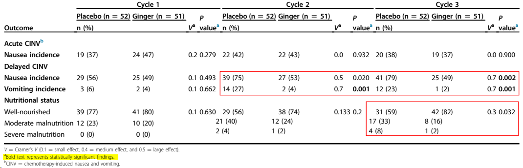 1)在第2、3个周期中,与安慰剂相比,姜根胶囊降低延迟期CINV发生率。
