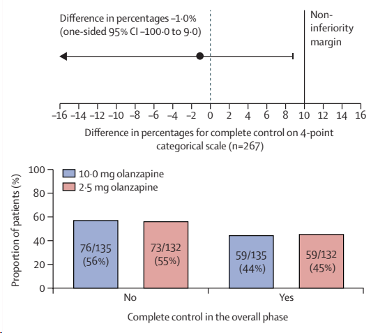 2.5 mg奥氮平组的132例患者中,59例患者实现完全控制,占比45%。10 mg奥氮平组的135例患者中,59例患者实现完全控制,占比44%。完全控制率的组间差异为-1%(单侧95%置信区间(CI)为-100%~9%,p=0.87),未超出10%的非劣效性边界。