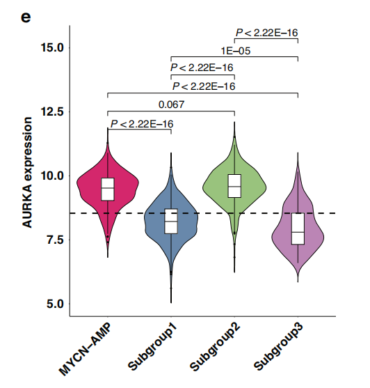 AURKA是一种调节有丝分裂的激酶,在亚组2中的表达水平更高,可以预测MYCN 非扩增NB的总体存活率。此外,较高的AURKA水平是死亡率的独立预测指标。