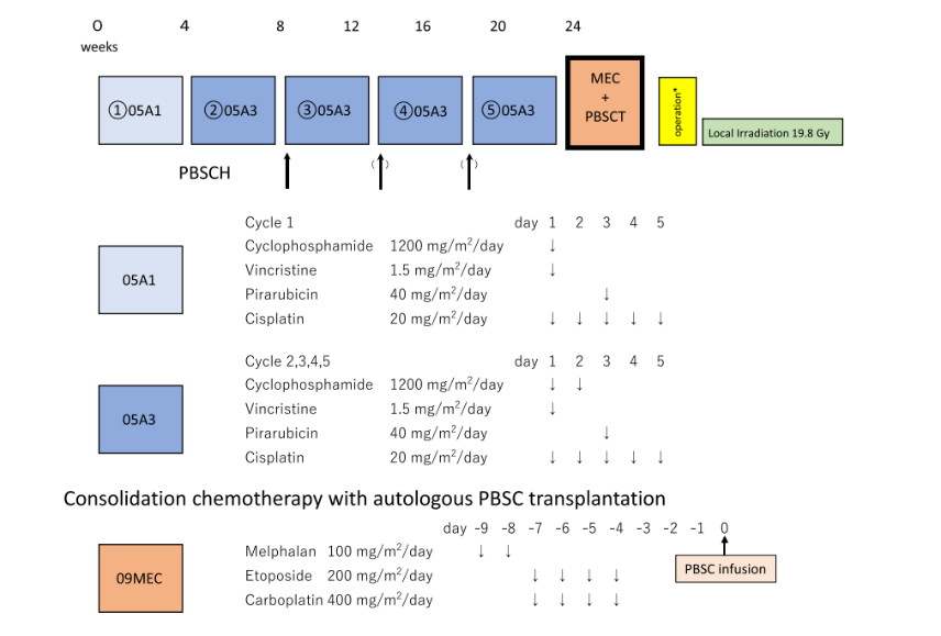1)入组高危NB患者接受5个疗程的诱导治疗及以MEC为预处理方案的自体干细胞移植,在移植结束后接受延迟的手术和放疗诱导化疗包含顺铂(100mg/m²)、吡柔比星(40mg/m²)、长春新碱(1.5mg/m²),以及环磷酰胺(第一疗程1200mg/m²,第二至第五疗程2400mg/m²)。在五个诱导化疗疗程后,所有患者立即接受了美法仑、依托泊苷联合卡铂(MEC)的高剂量化疗,随后进行自体干细胞移植。在移植后,进行了局部肿瘤的手术切除和放疗。