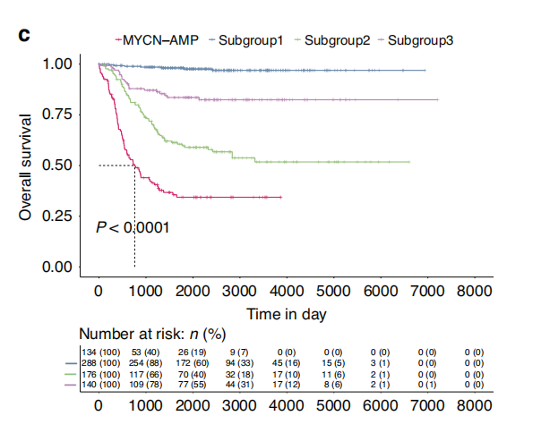 图.MYCN扩增和三个MYCN非扩增亚组患者的总生存率多变量分析也显示,研究确立的亚组分类独立于基因组特征,如1p、11q和17q。值得注意的是,分子亚组分类优于INSS分期,并显示出与危险度分层相当的预测精度。