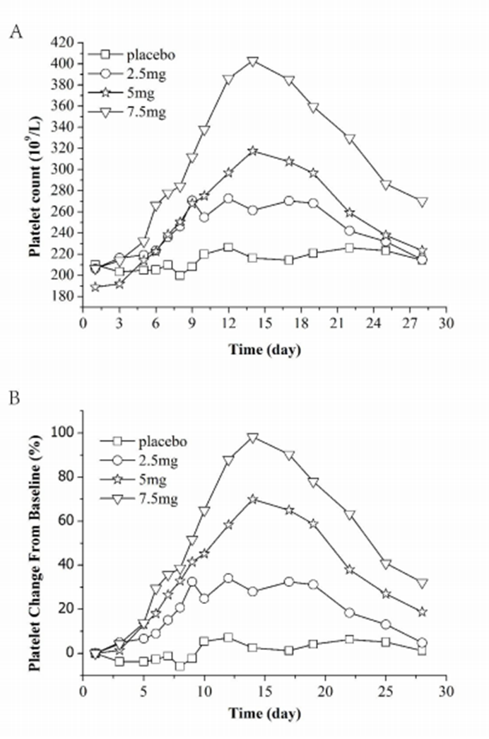 目前国内获批SAA适应症的TPO-RA仅2种,艾曲泊帕和海曲泊帕。海曲泊帕是我国自主研发的新一代口服、小分子、非肽类TPO-RA,其化学结构与艾曲泊帕不同。既往研究发现联苯结构可能具有肝毒性,海曲泊帕以杂环羧基取代,降低肝脏毒性;用苯并饱和碳环取代二甲苯,增强亲脂性,提高了药效1。既往的药效动力学研究初步揭示了不同剂量下海曲泊帕引发的生物学反应强度,这不仅是制定合理给药方案的基础,更是优化治疗效果的重要依据。在针对健康中国志愿者的I期研究中,受试者分别接受海曲泊帕2.5 mg、5 mg或7.5 mg的剂量,每日一次,连续10天治疗2。结果显示,从连续服药第6天开始血小板计数呈持续增长,在第12天至第14天(停药后2~4 d)达到峰值,2.5、5.0、7.5 mg组血小板计数相比基线平均最大增长率分别为34.1%、69.9%和98.2%。随后血小板计数逐渐回落,在第28天(停药后18d)时2.5mg组血小板计数基本降至基线,而5.0、7.5 mg组的血小板计数相比基线平均最大增长率分别为18.8%和32.2%。可以看出,海曲泊帕介导的升血小板效应具有剂量依赖性。图1. 安慰剂组和不同浓度海曲泊帕组的血小板计数(10⁹/L)变化(A)和相较基线的血小板计数百分比变化(B)在最初探索海曲泊帕在AA中的治疗潜力时,研究者多采用剂量滴定的方式给药。在中国人群中开展的II期研究中,为期18周的核心研究期间,55名难治性SAA患者每天口服海曲泊帕7.5mg3。如果经过两周后,血小板计数较基线未增加20×109/L,且患者可耐受药物毒性,则海曲泊帕每两周以单次2.5 mg的递增幅度逐步调整,最高剂量可达每日15mg。结果显示,在研究结束时,94.5%患者能够滴定到15mg/天的海曲泊帕,且疗效良好,12个月的无复发生存率高达82.2%。随着TPO-RA药物研究的成熟,其在SAA一线治疗中的潜力被逐步证实,为了更好地规范其应用,优化治疗方案,研究者探索了TPO-RA在SAA患者中的最佳应用疗程。2017年,美国国立卫生研究院开展了一项前瞻性、1-2期研究,旨在评估标准IST联合TPO-RA一线治疗SAA的有效性与安全性4。在这项研究中,依据不同TPO-RA的给药方案,入组患者被分为三个队列,队列1的患者在ATG使用后14天到3个月加用艾曲泊帕,队列2的患者在使用ATG后14天到6个月加用TPO-RA,而队列3的患者在ATG治疗第1天同时应用TPO-RA至6个月。疗效数据显示,相较于队列1和队列2,暴露于TPO-RA时间最长的队列3患者人群取得的6个月完全缓解率(CR)和总缓解率(ORR)均明显更高。基于该项研究报道的结果,我国于2022年更新推出的AA指南推荐TPO-RA在ATG应用第1天同时给药,以确保实现最佳疗效5。表1.不同TPO-RA给药方案联合IST治疗SAA的血液学缓解情况