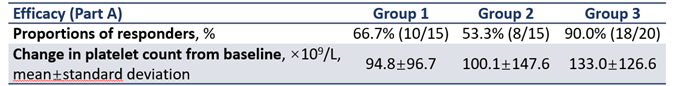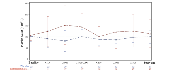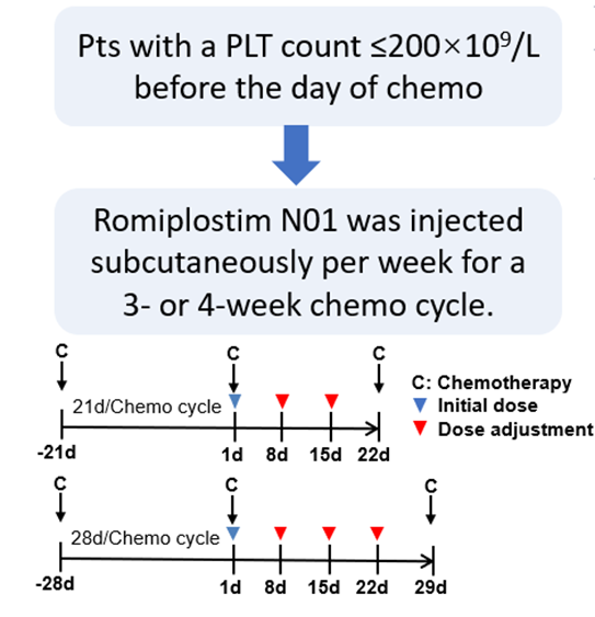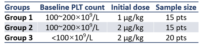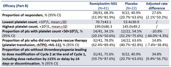 在Part A中,纳入了确诊为实体瘤或淋巴瘤,因化疗、靶向治疗或免疫治疗导致血小板减少(PLT≤200×109/L)的患者。根据基线PLT水平,患者被分为三组(表1),分别给予不同剂量的罗普司亭N01,以探索其最佳剂量和给药方案。Part B则纳入了PLT 75~150×109/L的患者,随机分配至罗普司亭N01组或安慰剂组,评估其在预防CTIT中的疗效和安全性。拓展阅读: