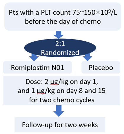 本研究旨在评估罗普司亭N01在CTIT患者中的疗效和安全性,探索其在不同治疗导致的血小板减少症中的应用。研究包括两个部分:Part A为开放标签的剂量探索研究(图1),Part B为随机、双盲、安慰剂对照的疗效验证研究(图2)。