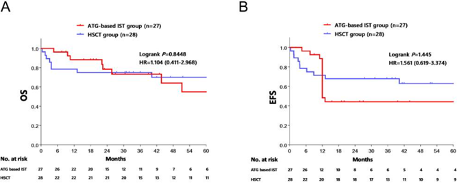 随着研究者对TD-NSAA患者临床特征的深入研究,发现该类人群面临着极高的疾病进展风险,以中国数据为例,回顾性研究显示,高达58.5%的TD-NSAA患者进展为SAA,中位进展时间为24个月1。虽然造血干细胞移植(HSCT)始终被认为可治愈AA的手段,但是在中国,由于供体、医疗资源以及经济原因导致只有少数患者可从HSCT中获益,药物治疗仍是主流2。既往临床治疗TD-NSAA多采用以CsA为主、输血支持及促造血治疗为辅的治疗方案,治疗效果欠佳。近年来,ATG联合CsA的标准IST方案逐步投入TD-NSAA应用,早期的血液学缓解率明显提升,可达60%~70%,但是长期预后数据却鲜有报道3,4。近期,中国学者开展了一项单中心、回顾性研究,共分析了55例TD-NSAA患者,其中27例接受基于ATG的IST治疗,28例接受同种异体HSCT4。研究结果显示,IST组的5年总生存率(OS)为56.5%,HSCT组为70.3%(p>0.05)。而IST组的5年无事件生存率(EFS)为35.9%,也就是说,近七成患者在5年内经历了疾病进展、复发以及治疗无效等事件。此外安全性分析中,IST组的血清病发生率为37.0%。综合来看,标准IST方案无法满足TD-NSAA患者的治疗需求,长期预后尚待提升。图1.IST与HSCT治疗TD-NSAA患者的5年OS(左)和5年EFS(右)TPO-RA联合IST协同增效