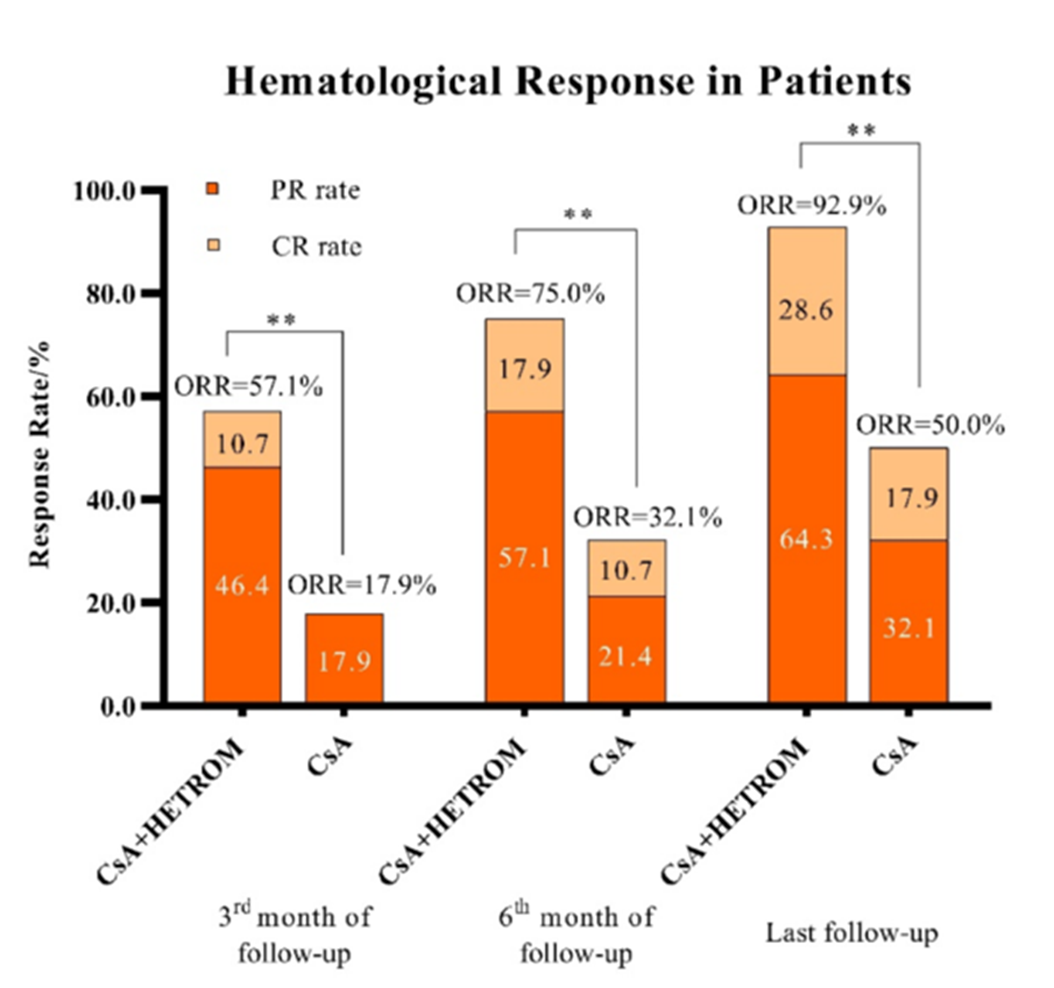海曲泊帕是我国首个获批AA适应证的TPO-RA类药物,它于2021年获得国家药品监督管理局(NMPA)批准在我国用于对IST疗效不佳的成人SAA患者,并成功纳入医保目录,减轻患者医疗负担。此外,海曲泊帕分子结构中含有铁离子螯合基团,可降低铁过载AA患者的血清铁蛋白水平8。基于其理想的药物学特点,研究者已经在TD-NSAA的一线治疗中探索其疗效。2024年,中国学者开展了一项单中心、前瞻性II期研究,纳入了28例在6个月内被诊断为TD-NSAA且未接受过治疗的患者9。入组患者接受海曲泊帕联合CsA,海曲泊帕的开始剂量为每天10mg,最高剂量未超过15mg。研究者采用了具有相同基线特征且使用CsA单药治疗的历史队列作为对照组。结果显示,治疗3个月后,海曲泊帕组的总缓解率(ORR)显著高于CsA对照组(57.1% vs. 17.9%,P=0.001)。6个月后,海曲泊帕组的ORR也高于对照组(75.0% vs. 32.1%,P<0.001),最后一次随访时,海曲泊帕组的ORR仍然显著更高(92.9% vs. 50.0%,P<0.001)。安全性分析显示,仅1例患者报告3级不良反应,该患者的每日用药剂量减少至5mg,其余患者均未减量或停止使用海曲泊帕,此外,两组的克隆进化的发生率无统计学差异。图3.TD-NSAA患者接受CsA联合海曲泊帕或CsA单药治疗的TD-NSAA患者在3个月、6个月和随访结束时的血液学反应