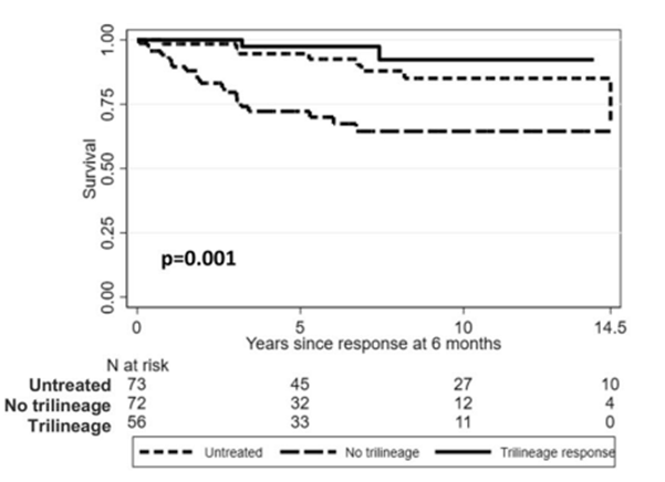 在AA中,免疫系统异常攻击骨髓中的造血干细胞,导致全血细胞减少。而TPO-RA被证实可以刺激造血干细胞数量的增加和功能的提高,且内源性血小板生成素水平的高低并不会影响TPO-RA刺激造血的能力,故其在AA治疗中的应用具有理论支持5。基于此,TPO-RA与IST联合方案已在AA领域开展了多项研究,联合方案覆盖了AA发病机制的多维度因素,已被证实能够提高AA患者的血液学缓解速度和强度,减少输血需求。2023年,欧美学者开展了一项多中心、观察性研究,旨在评估259例NSAA患者的的临床特征、治疗需求以及生存结果6。该研究队列的中位年龄为50岁,其中127名患者依赖输血。入组患者接受的治疗包括单独使用CsA(n=84),CsA与ATG联合使用(n=44),CsA与TPO-RA联合使用(n=20)、单用TPO-RA(n=10)或其他治疗(n=25)。结果显示,相较于其他治疗方式,接受CsA联合TPO-RA的患者有更高的三系反应率(63% vs 37%,p=0.02)。而生存结果分析中,与未接受治疗以及未实现三系反应的NSAA患者相比,实现三系反应患者的长期生存率显著更高(P=0.001)。综合来看,这一研究证实TPO-RA联合CsA可以提升TD-NSAA患者的血液学反应质量,进一步改善预后。图2.实现三系反应与未实现三系反应NSAA患者的总生存期拓展阅读: