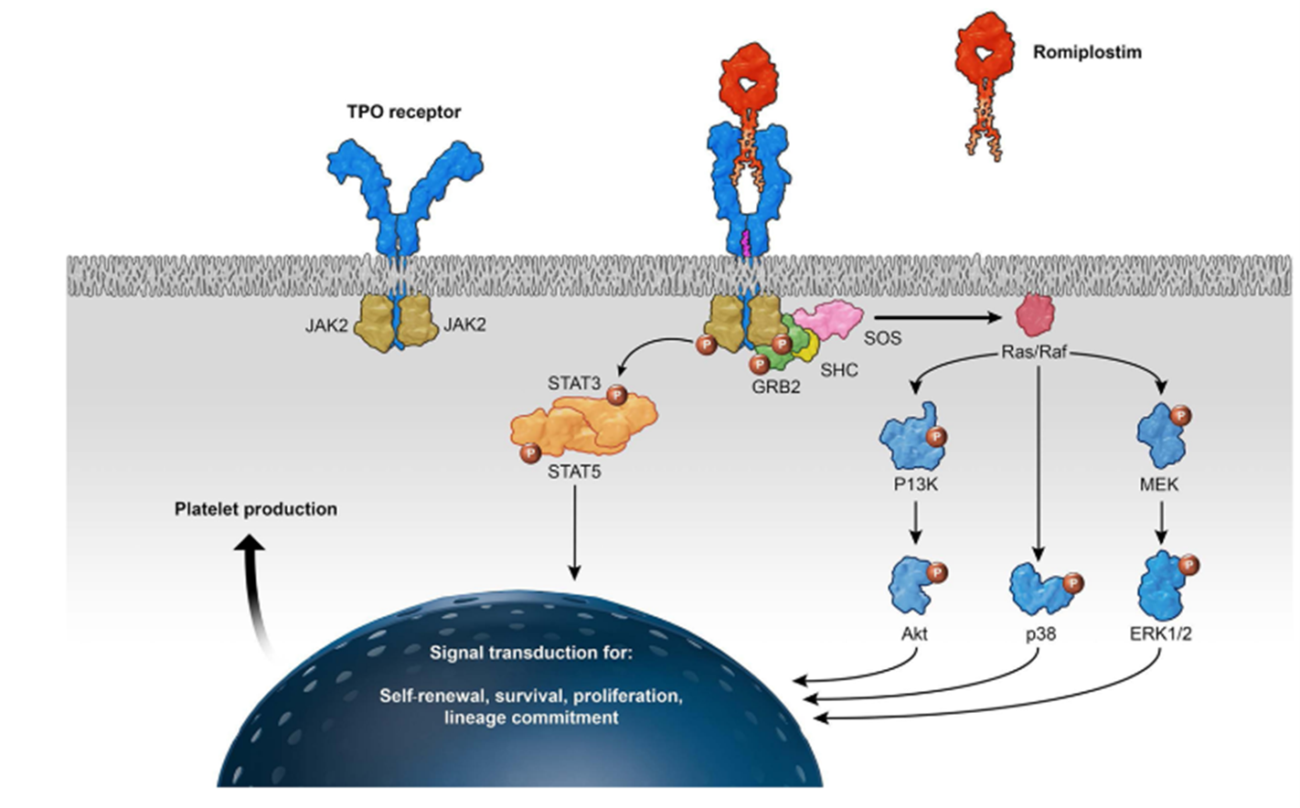罗普司亭是一种由四个TPO-R 结合域和一个载体Fc域构成的多肽,与 TPO 受体(MPL)具有高亲和力。它能与巨核细胞前体上的 TPO 受体结合并激活,模拟 TPO 的作用,激活下游信号通路,涵盖 JAK2 - STAT5、PI3K/Akt、MEK/ERK 等,进而促进巨核细胞增殖、分化、成熟和血小板生成2(图2)。在慢性肝病相关血小板减少症中,尽管肝脏产生 TPO 能力下降,但罗普司亭可绕过这一障碍,直接作用于骨髓中的巨核细胞,刺激血小板生成,从而提升血小板计数。图2 罗普司亭升血小板的作用机制