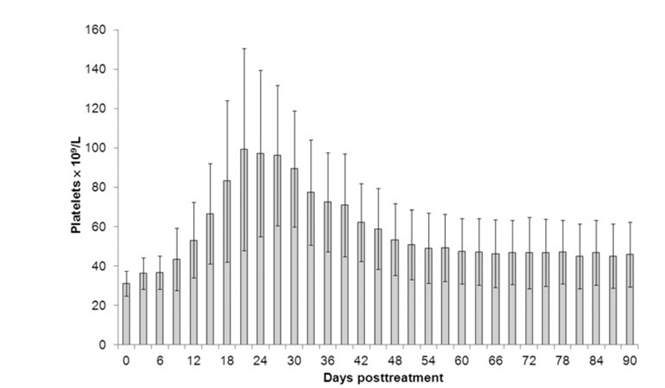 动物基础研究验证了罗普司亭在肝病相关血小板减少症中提升血小板计数的作用。一项动物研究使用了一百二十只成年雄性白化大鼠,将其分为四组,评估血小板生成素受体激动剂罗普司亭在慢性肝病(CLD)中的治疗作用。结果显示,接受罗普司亭的大鼠组的血小板计数与其他组相比显著增加。随着时间的推移,接受罗普司亭的大鼠血小板计数进一步增加。同时,罗普司亭对所有大鼠组的肝功能测试没有显著影响,对不同大鼠组的肝脏组织病理学检查也没有影响。在慢性肝病相关血小板减少症患者的择期手术中,罗普司亭同样发挥了关键作用。Moussa 和 Mowafy的研究5针对 35 例慢性丙型肝炎、肝硬化且血小板减少的男性患者,术前给予罗普司亭治疗,剂量为2mg/kg Q1W,最长治疗一个月,目标血小板计数为70×109/L。结果显示,94%(33/35)的患者血小板计数达到或超过70×109/L,成功满足手术条件。治疗后血小板计数迅速上升,平均最高峰值为99×109/L(图3)。所有患者术后无出血或血栓并发症。这有力地证明了术前使用罗普司亭可有效提升血小板计数,为慢性肝病合并严重血小板减少症提供了安全有效的治疗方案。