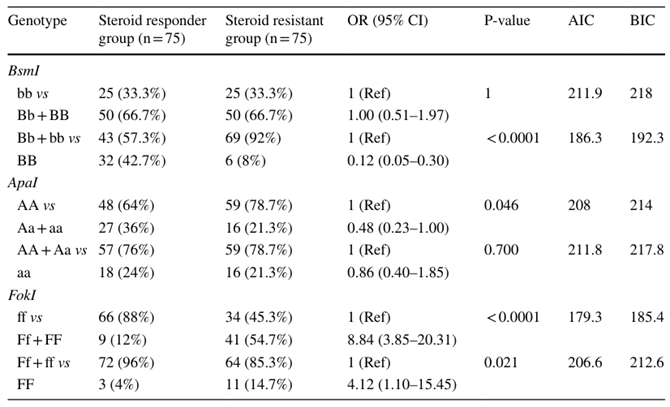 表3,皮质类固醇反应与耐药患者的BsmI/ApaI、BsmI/FokI