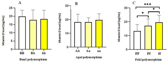 图1,所有ITP患者(n=150)中不同VDR基因多态性的维生素D水平图A,BsmI多态性;图B,ApaI多态性;图C,FokI多态性;*,p<0.001;***,p<0.0001整体而言,FokI F等位基因携带者不仅皮质类固醇耐药的风险增加,而且维生素D水平显著更低。拓展阅读: