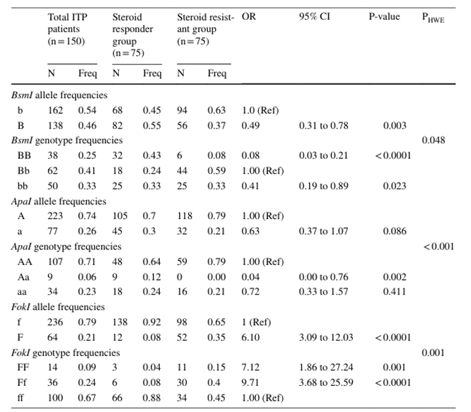 该项研究纳入了150例成年原发性ITP患者,根据患者对既往一线皮质类固醇治疗的反应情况,将其分为反应组和耐药组,每组各75例。所有患者既往均接受了短期口服泼尼松治疗,具体方案为1 mg/kg/天,并在4周内逐渐减量,其中对治疗有反应定义为:在间隔7天的两次测量中,血小板计数均>100×109/L;未达到上述标准的则被定义为皮质类固醇耐药1。研究者通过VDR BsmI、ApaI和FokI的基因分型与基因频率分析发现,BsmI基因的B等位基因在皮质类固醇反应组中的频率显著高于耐药组(p=0.003),提示B等位基因可能与皮质类固醇治疗的反应性相关;在ApaI基因中,AA基因型的患者在耐药组中的比例较高,而Aa基因型则在治疗反应组中更为常见(p=0.002),表明ApaI基因多态性同样可能对皮质类固醇治疗反应产生影响;此外,研究者发现,FokI基因与皮质类固醇耐药性之间的关联更加显著,具体而言:FokI F等位基因的携带者皮质类固醇耐药的风险较非F等位基因携带者显著增加6.1倍(p<0.0001),同时,FF和Ff基因型在皮质类固醇耐药组中的频率显著高于反应组。