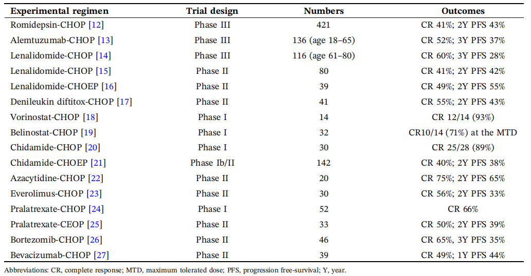 尽管数十年来学者尝试通过在CHOP基础上叠加新药(即“CHOP-plus”策略)提升疗效,但绝大多数III期试验未能证实显著生存获益。根据文献中汇总的多项临床研究数据,包括罗米地辛-CHOP、阿仑单抗-CHOP、来那度胺-CHOP等方案,尽管部分显示出较高的完全缓解率(CR),但在无进展生存期(PFS)和总生存期(OS)方面均未实现突破性改善。