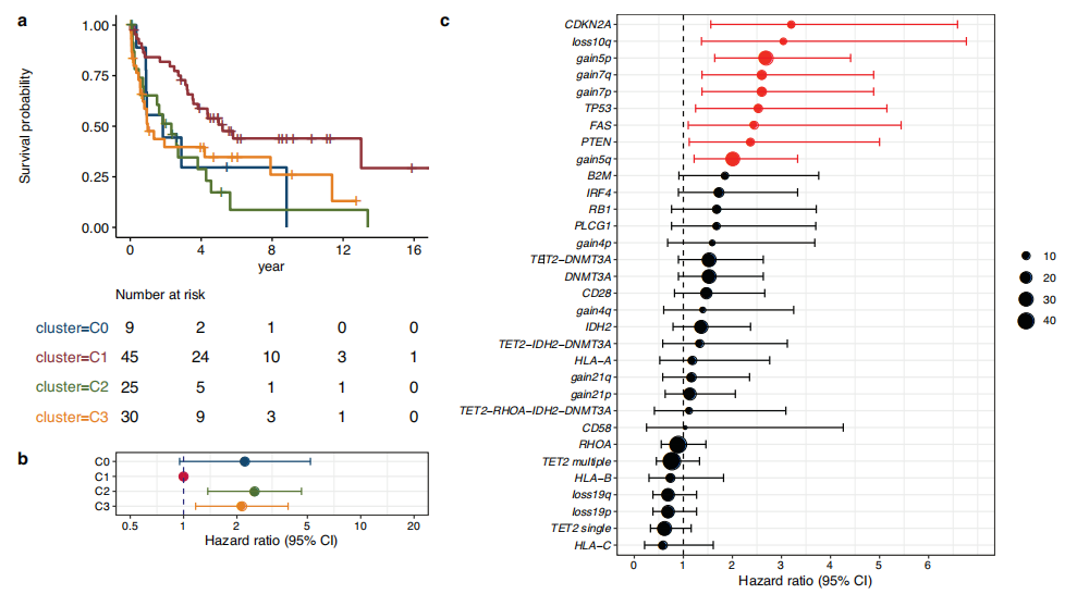 研究先通过非负矩阵分解聚类,将PTCL划分为4种遗传亚型:C0(10例,无反复遗传异常)、C1(57例,84%为nTFHL,以TET2、RHOA等TFH相关突变为核心,基因组稳定,预后最佳)、C2(28例,32%为nTFHL,多为PTCL-NOS,伴CDKN2A、TP53等抑癌基因缺失及染色体不稳定,肿瘤突变负荷最高,预后最差,HR=2.52)、C3(34例,94%为nTFHL,虽含TFH相关突变,但额外携带高频IDH2突变[67.6%]及5号染色体扩增[55.9%],预后中等偏差,HR=2.14);同时基于免疫细胞比例将TME分为3型:TME1(B细胞、TFH细胞富集,几乎全为AITL)、TME2(巨噬细胞尤其M2型富集,预后最差,HR=3.4)、TME3(活化肥大细胞、原始CD4+T细胞富集,预后较好)。