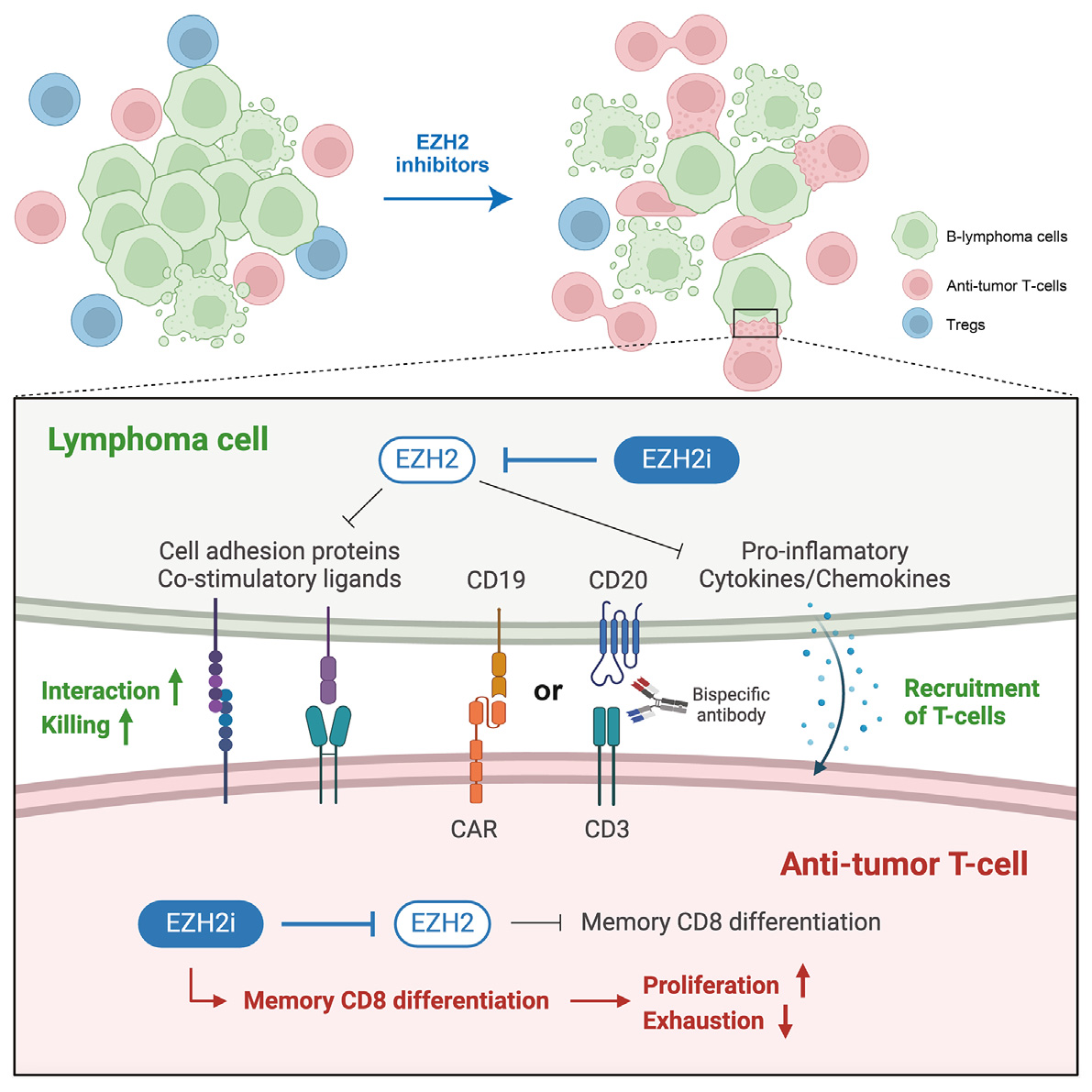 传统上认为,EZH2突变通过表观遗传沉默关键基因促进淋巴瘤发生发展,并抑制MHC表达以削弱抗原呈递能力。但最新研究挑战了这一认知,一项发表于《Cancer Cell》的研究1揭示,EZH2抑制不仅可逆转肿瘤免疫逃逸,还能直接增强T细胞功能,从而显著提升T细胞免疫疗法的疗效。