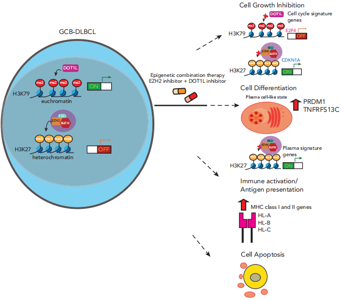 机制层面,联合治疗通过三重途径起效:一是表观遗传协同调控,EZH2抑制减少H3K27me3以解除PRDM1、CD138等浆细胞分化基因抑制,DOT1L抑制减少H3K79me2以下调MYC、E2F1等细胞周期基因,同时上调CDKN1A/p21阻断增殖;二是免疫微环境重塑,激活IRF7、CIITA等干扰素通路基因,恢复EZH2突变型细胞中MHCI/II抗原呈递基因低表达,改善肿瘤免疫逃逸;三是协同诱导B细胞向浆细胞分化及肿瘤细胞凋亡。