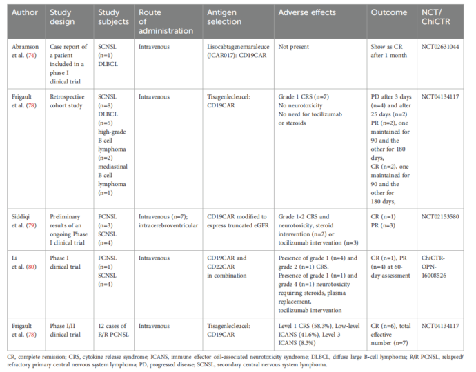 CAR-T细胞疗法作为血液系统肿瘤领域的革命性手段,正逐步拓展至PCNSL领域。尽管早期因担心细胞因子释放综合征(CRS)、CAR-T相关脑病综合征(CRES)和神经毒性而被排除在多数试验之外,但随着技术优化,越来越多研究开始纳入CNS受累患者。