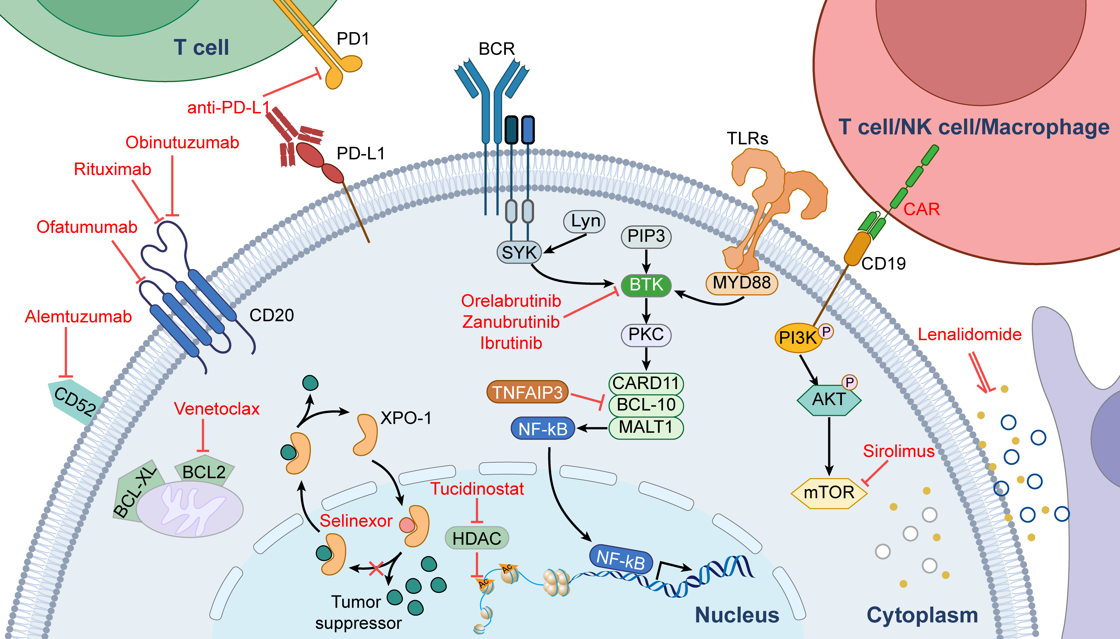PCNSL具有典型的免疫逃逸特征,肿瘤微环境中存在大量表达PD-1的T细胞浸润淋巴细胞(TILs)和表达PD-L1的肿瘤相关巨噬细胞(TAMs),形成高度免疫抑制状态,高PD-1表达与较差总生存相关。这一机制为免疫调节剂和免疫检查点抑制剂的应用提供了理论基础。