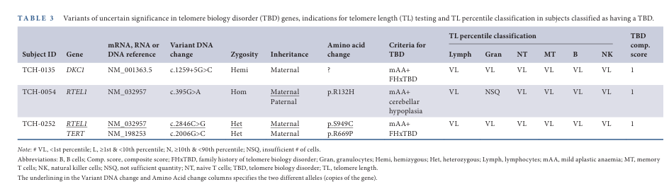 除了Flow-FISH,基因检测在TBD诊断中亦扮演重要角色。本研究中,16例TBD患者携带致病/可能致病基因突变,涉及ACD、DKC1、TERT、TINF2等基因。然而,仍有部分临床诊断TBD患者未发现已知基因突变,提示存在尚未被识别的TBD相关基因。