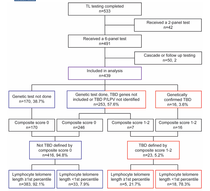 本研究回顾性分析了2008年至2022年间在德克萨斯儿童医院接受详细端粒Flow-FISH检测的439例患者,其中AA患者占56%(247例)。研究团队建立了独立于端粒长度的TBD综合评分系统,包含基因突变、典型临床特征和家族史三个维度。通过这一系统,共鉴定出23例(5.2%)TBD患者。