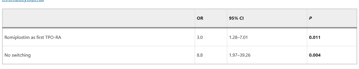 约10%-30%的慢性ITP患者在TPO-RA治疗数年后可尝试减停,成功率与治疗持续时间及血小板计数稳定性相关。现有证据表明,罗普司亭相较于口服小分子TPO-RA更易获得无治疗缓解。西班牙多中心回顾性研究显示,接受长时间罗普司亭治疗的ITP患者获得无治疗缓解的概率约是小分子TPO-RA的2.1倍(51.3% vs.24.4%,P=0.001)。此外,通过单因素回归分析显示,若将罗普司亭作为首选用药可使TFR概率提高3倍(OR:3.0,P=0.011)。9