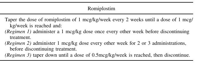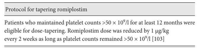 根据国外共识中推荐的减停策略——罗普司亭剂量每2周减少1μg/kg,直至减量至1μg/kg后,方案1:以1μg/kg剂量,每两周给药1次,随后停药;方案2:以1μg/kg剂量,每2周给药1次,共给药2-3次,随后停药;方案3:逐步减量至0.5μg/kg/周,随后停药。减停过程中应至少每周监测1次血小板计数,停药后应持续监测血小板计数至少2周。2
