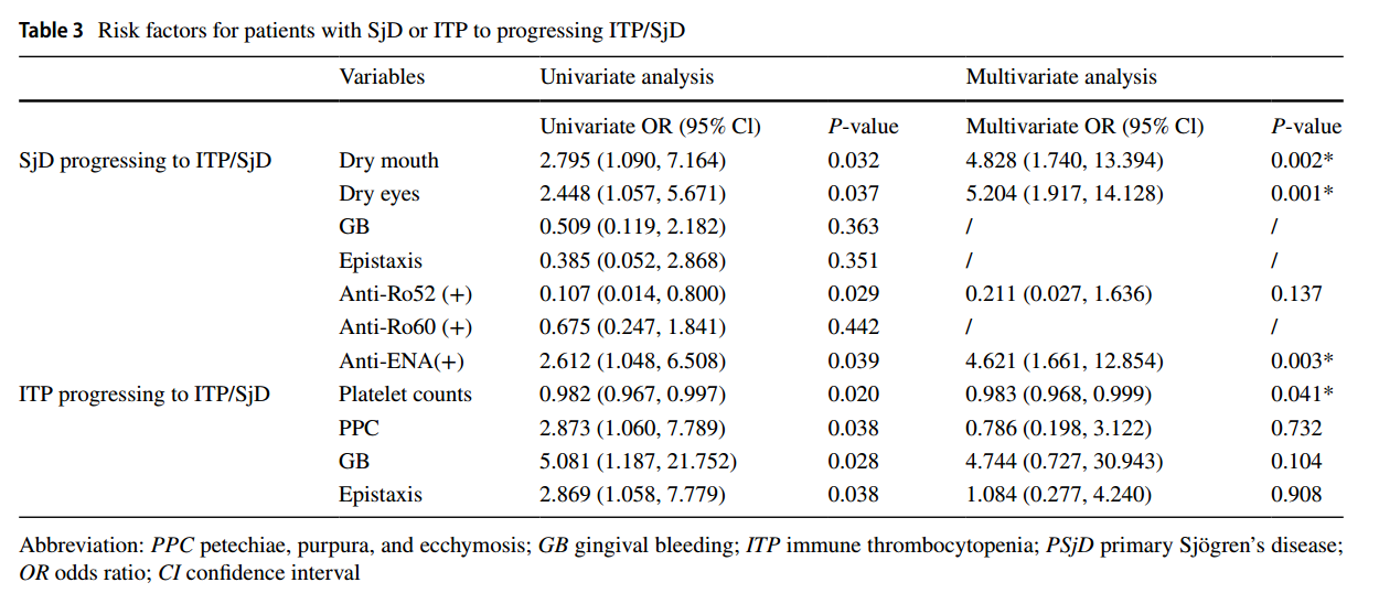 本研究首次系统阐述了ITP与SjD双向关联的临床特征与风险因素,为这一特殊患者群体的管理提供了重要循证依据。研究发现的血小板计数、干燥症状和抗ENA抗体等预测因子,具有明确的临床实用价值,有助于早期识别高危患者并实施个体化监测。然而,本研究作为单中心回顾性分析,存在一定局限性。样本量相对较小,且缺乏长期随访数据,