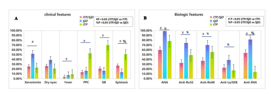 将ITP/SjD患者与单纯ITP、单纯SjD患者对比,可发现显著的临床差异。与单纯SjD患者相比,重叠综合征患者口干发生率更低(25.45%vs51.8%,p<0.001),鼻出血发生率更高(27.27%vs13.64%,p=0.012),同时血小板计数、IgA、IgG水平及ANA、抗Ro52等抗体阳性率均显著更低,提示重叠综合征患者的免疫紊乱特征与单纯SjD存在差异。
