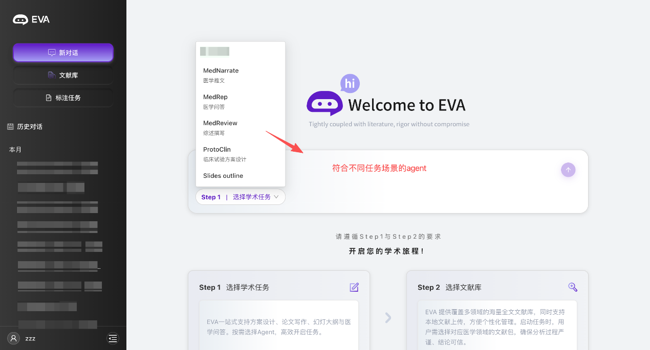 EVA通过“专属Agent+角色适配”机制实现深度场景化输出。其六大专属Agent精准对接多元需求:学术幻灯Agent可按场景调整内容深浅,推文创写Agent支持双轨生成,疾病问答Agent能按用户角色(医生、患者、医药代表)调整表达深度。同时,EVA深度内化学术规范与行业标准,确保不同场景下的内容既合规又专业,彻底摆脱“千篇一律”的量产困境。