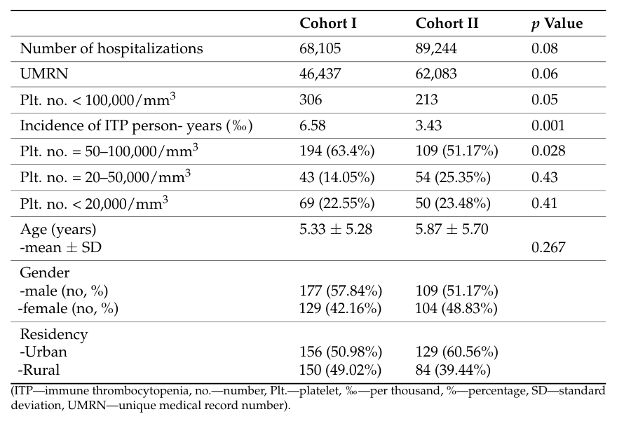 这项单中心研究纳入了罗马尼亚三级儿童医院的519例新诊断ITP住院儿童,其中2020-2024年病毒暴发期(队列I)306例,2015-2019年无病毒流行期(队列II)213例。值得注意的是,队列I期间因实施封锁、戴口罩、学校关闭等非药物防疫措施,住院总人数较队列II减少23.7%(68105人vs89244人)。