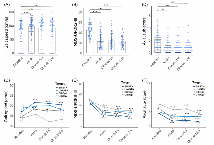 研究显示,PD患者基线平均步态速度仅80.6cm/s(远低于社区正常功能所需的100cm/s),而双侧STN或GPiDBS能带来显著且持久的改善。其中,双侧STN组患者步态速度从基线84.7cm/s提升至12个月的103.6cm/s(标准化效应量0.59,P<0.001),双侧GPi组从71.3cm/s提升至85.8cm/s(标准化效应量0.57,P<0.01),且改善效果在激活后5分钟(急性阶段)即显现(提升至97.4cm/s,P<0.001),并维持至1年。