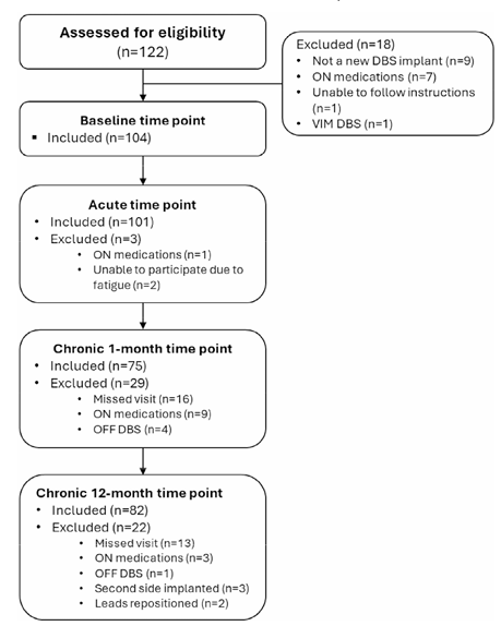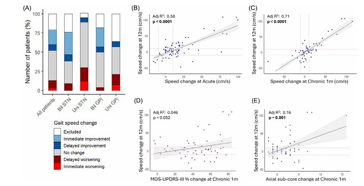 该研究的重要发现之一是,DBS激活后的急性步态速度变化与12个月随访结果强相关(Adj.R²=0.58,P<0.0001),且1个月时的步态速度变化相关性更强(Adj.R²=0.71,P<0.0001)。这意味着,若患者在DBS激活后短期内步态速度无明显改善,长期获益的可能性较低,临床医生需及时调整编程参数或重新评估靶点选择。