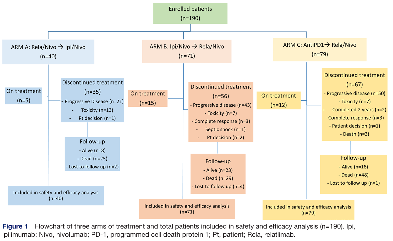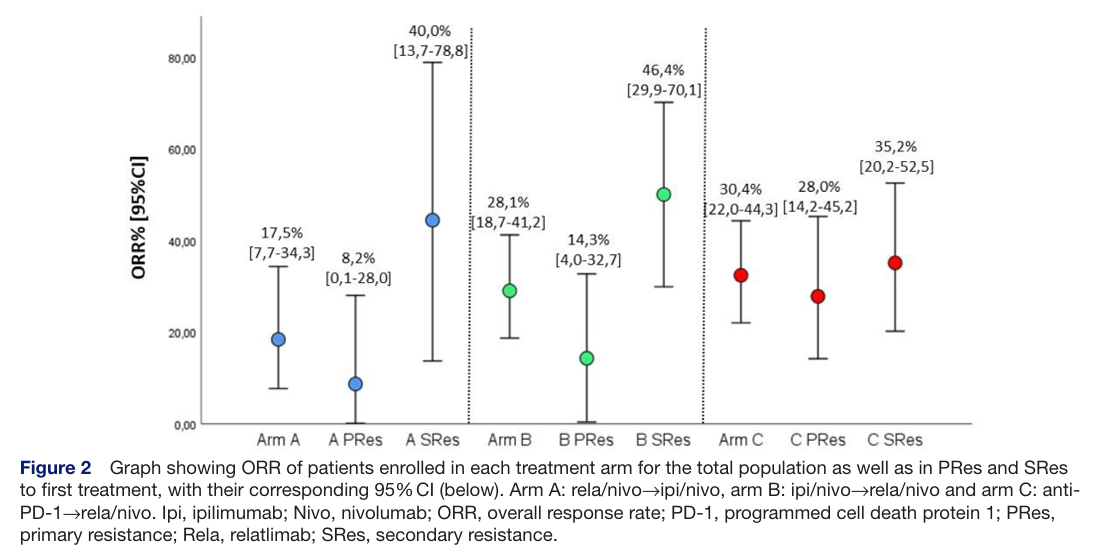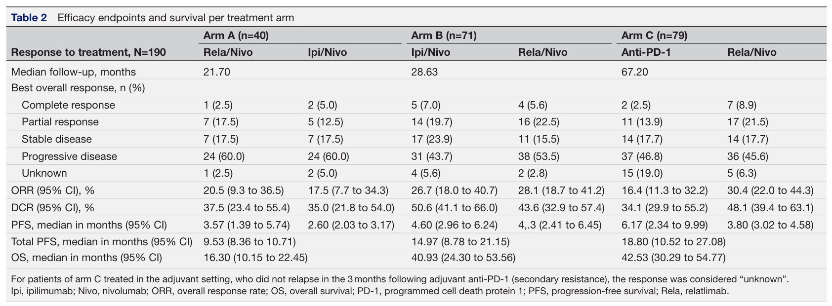 研究将患者分为三个治疗组:A 组(n=40)为 rela/nivo治疗进展后序贯伊匹木单抗+纳武利尤单抗(ipi/nivo),B 组(n=71)为 ipi/nivo 进展后序贯 rela/nivo;C 组(n=79)为抗PD-1单药(含辅助治疗)进展后序贯 rela/nivo。