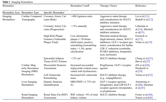 影像学生物标志物能直观反映器官结构与功能异常,是T2DM患者心肾风险分层的“眼睛”。其中,冠状动脉钙(CAC)评分是心血管风险的“黄金指标”——MESA研究显示,CAC评分>400Agatston单位的T2DM患者,心源性死亡风险增加8倍,远超传统风险因素的预测价值。若患者CAC年进展率>15%,提示需紧急干预,此时启动强化他汀+SGLT2抑制剂治疗,可显著降低心梗风险。