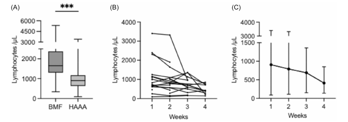 一是急性重症胆汁淤积性肝炎,所有患者均表现为严重肝炎(中位ALT2127U/L),95%出现高胆红素血症(中位胆红素15.3mg/dL),且γ-谷氨酰转移酶(GGT)相对较低(中位165U/L),提示胆汁淤积特征;二是早期淋巴细胞减少,这是HAAA最具特异性的标志——肝炎发作第1周,50%患者已出现淋巴细胞减少(中位905/µL),4周内进一步降至中位530/µL,而无肝炎的BMF患者中位淋巴细胞计数为1650/µL,无此表现;三是肝炎与BMF存在时间关联,两者中位间隔为3周,36%患者表现为同时发作,最长间隔可达20周。